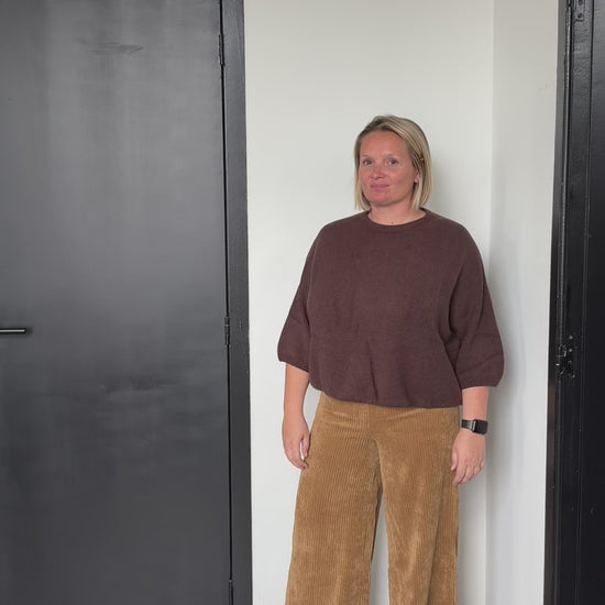 ruim en lang model / kleur camel / warme velour / volledig met rekband in de taille (geen knoop)/ past voor zowel maat small (Jo heeft maat 36 en doet best een riem in) als voor maat XL