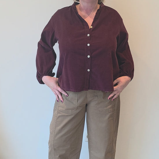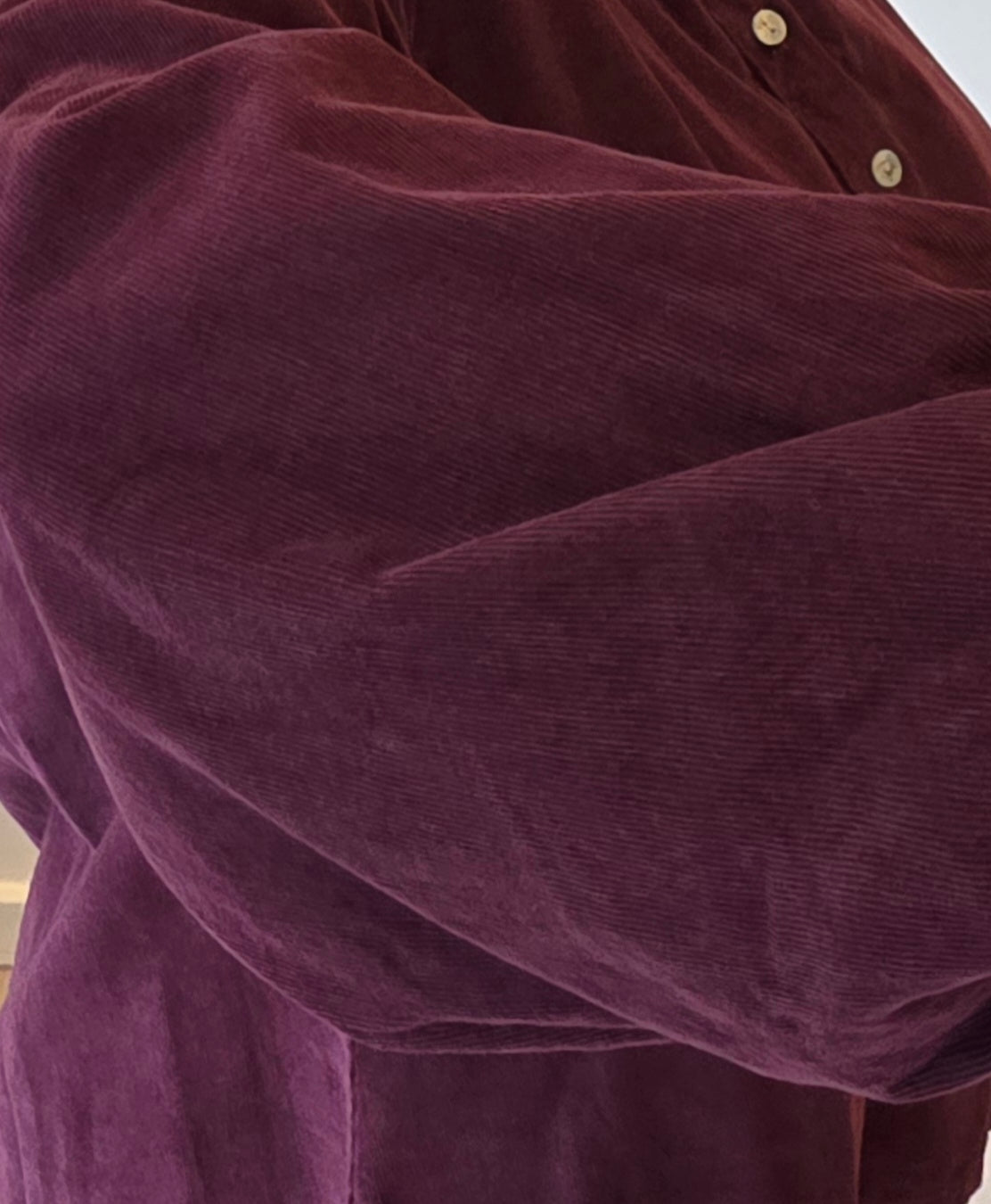 Deze oversized blouse komt in taille unique en past comfortabel voor maat 36 t/m 42. Warme uitstraling dankzij de lichte velour stof. Kleur warm bordeaux dus ideaal te combineren met andere trendy herfst- en winterkleuren. Asymmetrische snit (langer achteraan dan vooraan) Knoopsluiting gaat niet helemaal tot boven (lichte V-opening bovenaan) voor een elegante look.