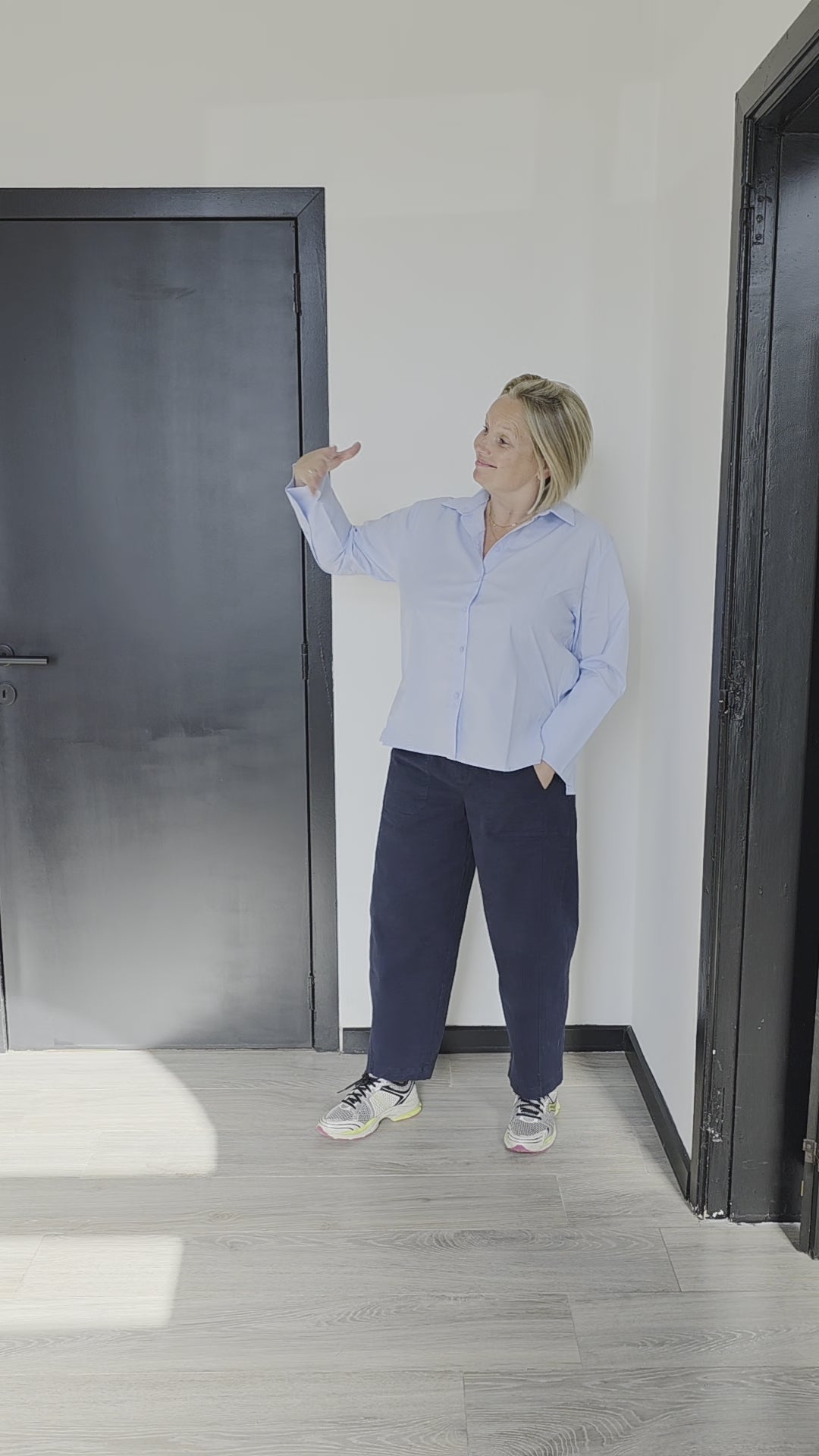 heel gemakkelijke stof (kreukt bijna niet) / kleur lichtblauw / valt vrij ruim / Jo draagt S en Sophie draagt M (en heeft met grotere cup maat geen probleem om te sluiten / de grote manchetten geven een extra touch / ideaal onder onze débardeurs