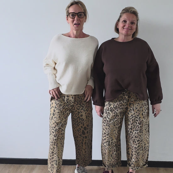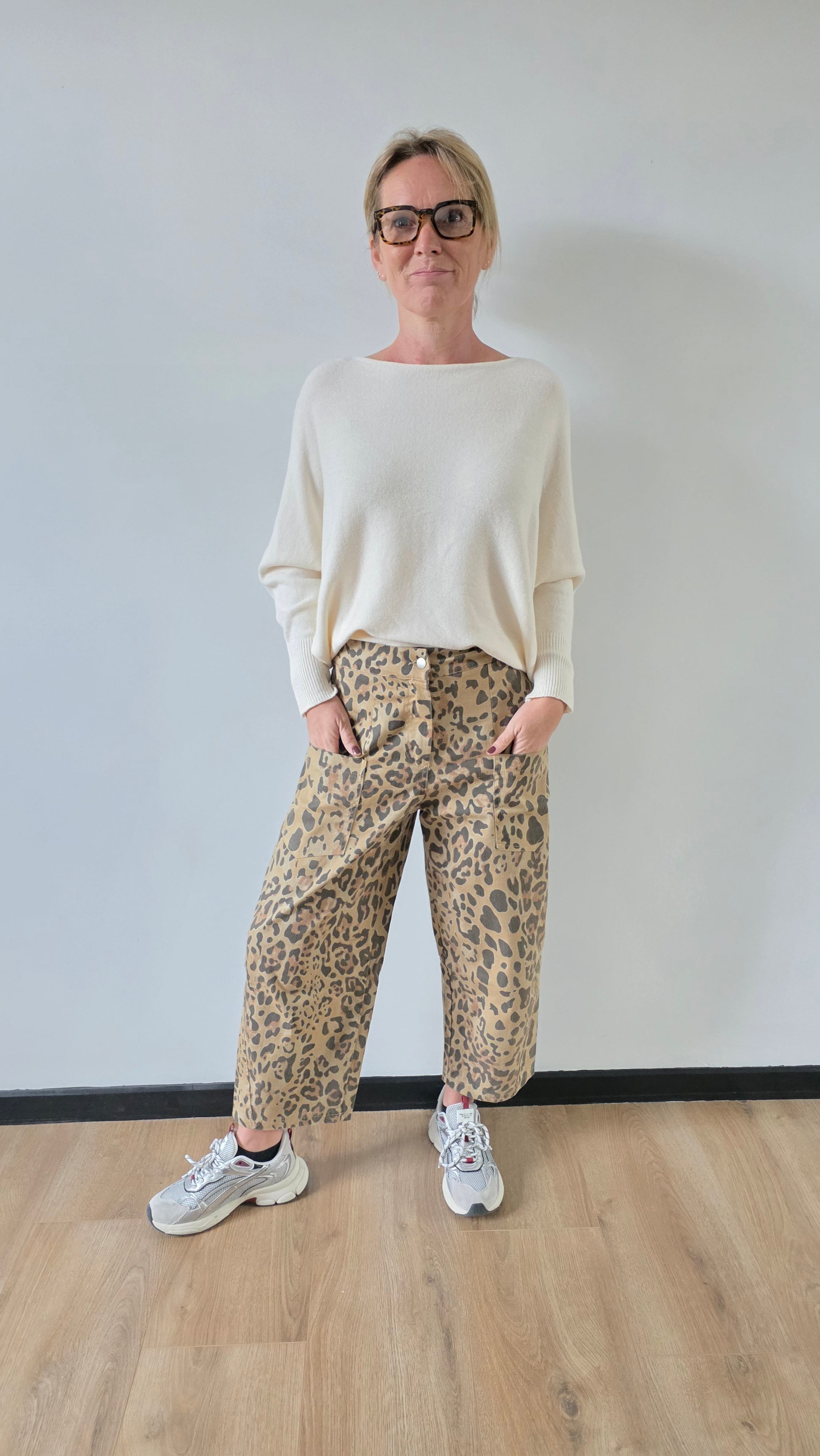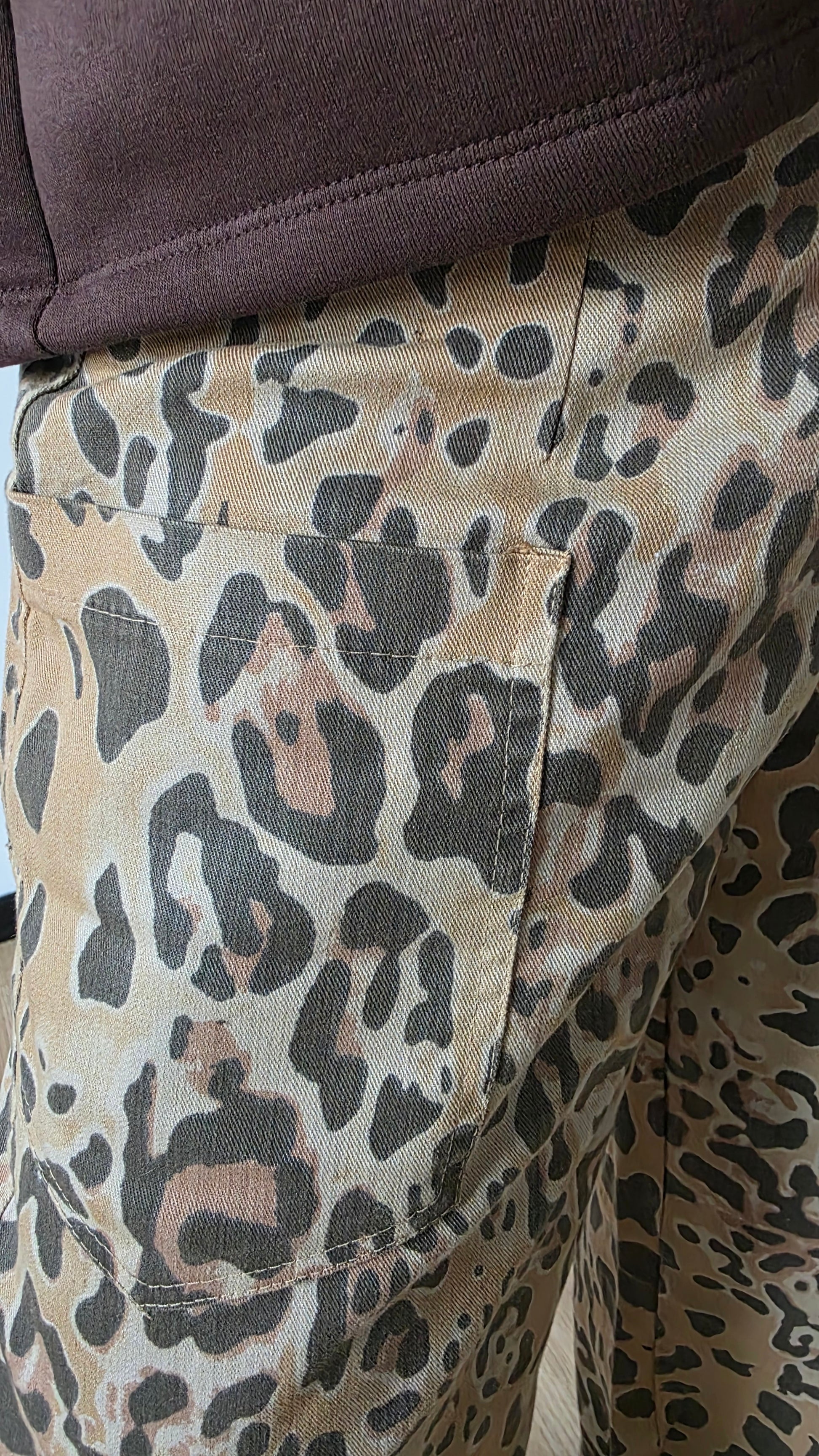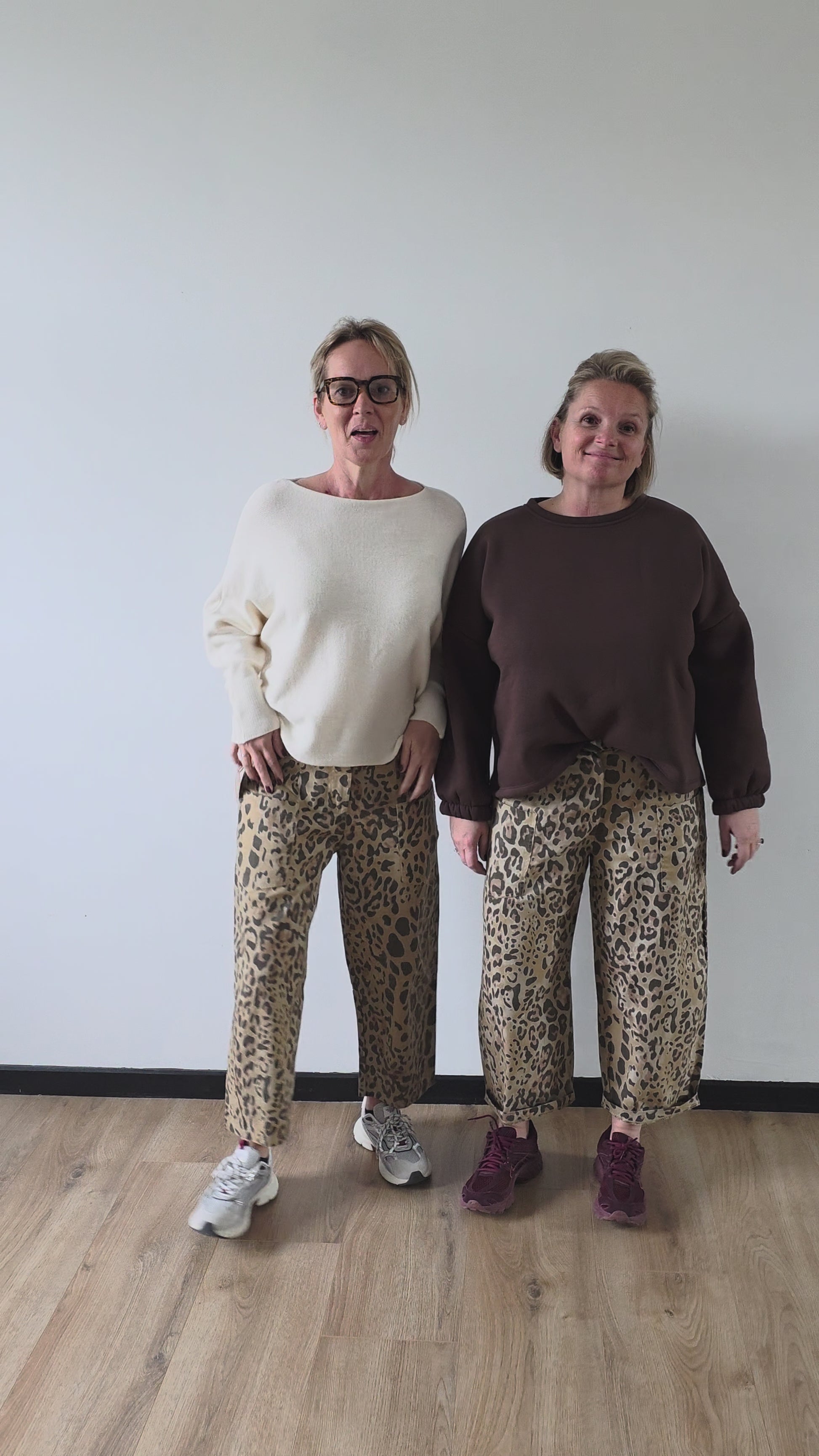 Deze coole broek heeft een baggy fit met trendy leopard print. Vooraan zitten 2 zakken die de casual look benadrukken. Knoopsluiting vooraan en elastische band in de taille achteraan. De broek is verkrijgbaar in S/M en L/XL dus past voor maat 36 t/m 42. Heerlijk om te dragen en perfecte snit