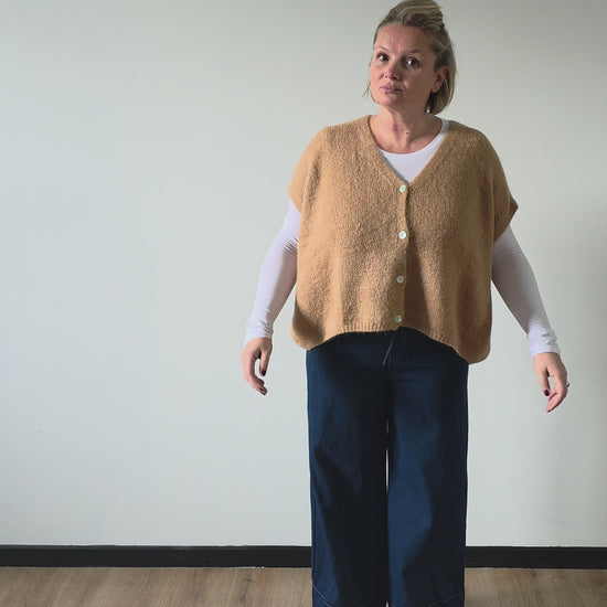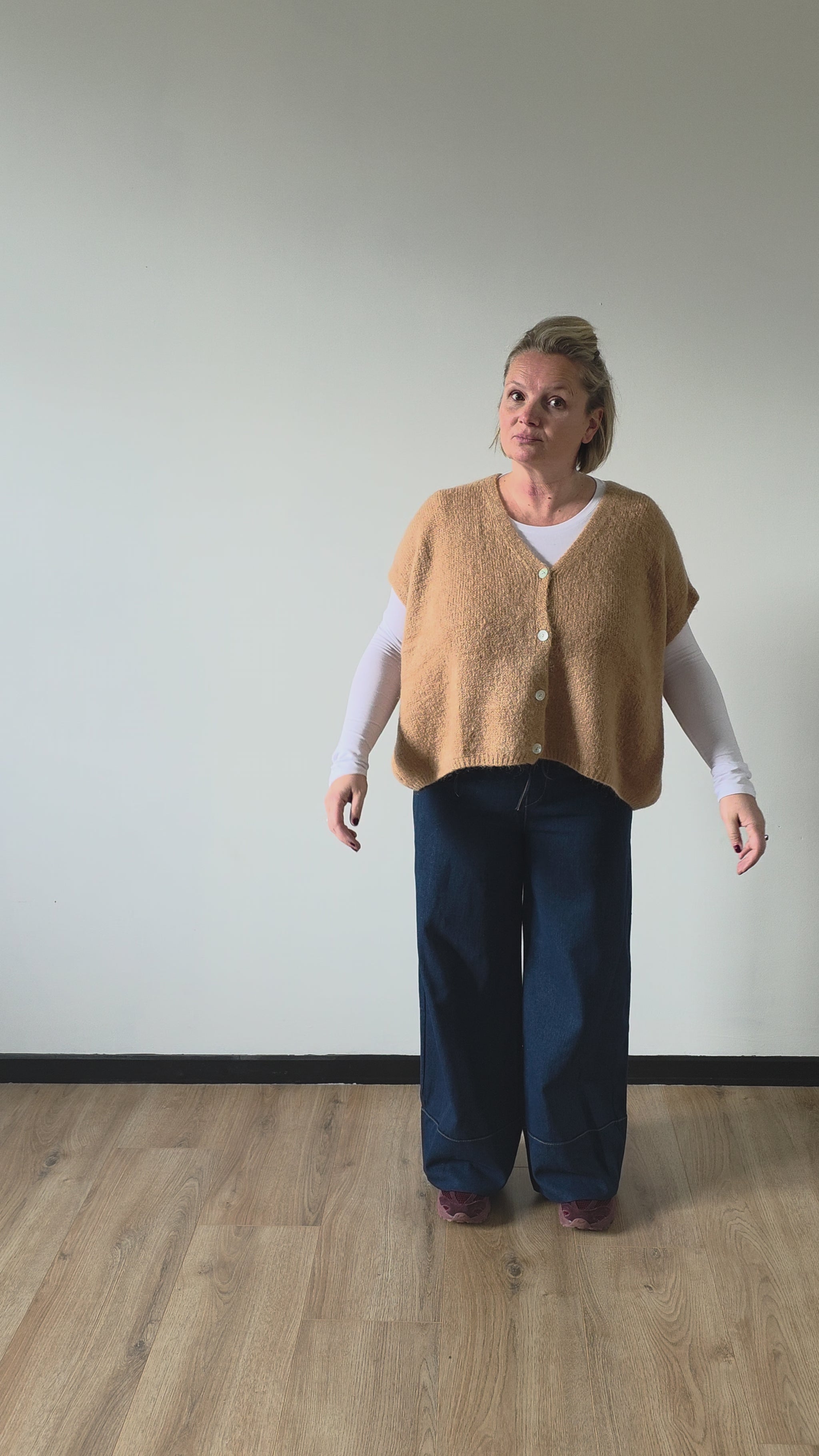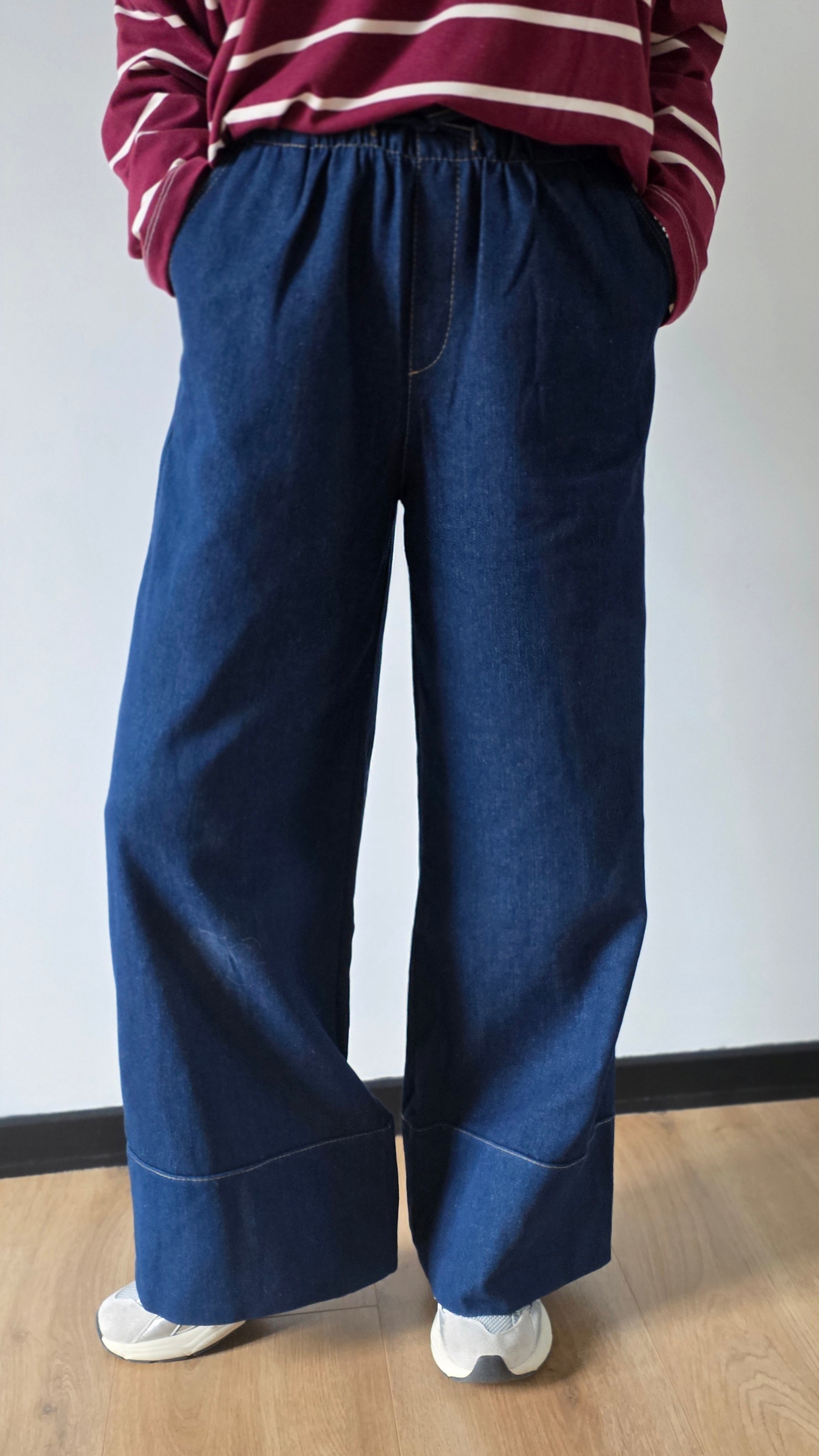 Deze jeans met wijde pijpen heeft een zeer comfortabele fit. Dankzij de elastische band in de taille past deze comfortabel voor maat 36 t/m 42. De tailleband is voorzien van een ingewerkt knooplint om de jeans aan te spannen indien nodig. Geen knoopsluiting, een rits. 2 steekzakken aan de zijkant. Kleur medium blue.