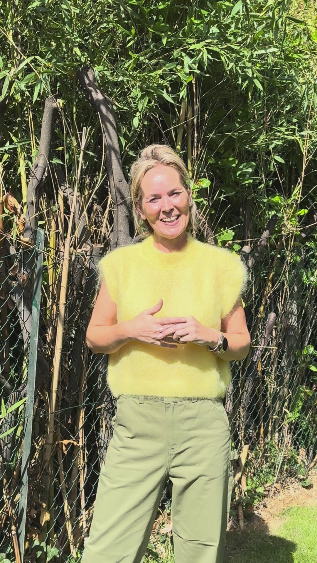 Kleur geel / ideaal op mid- of high waist broek (zie video) / te dragen met t-shirt of hemd of gewoon zonder iets