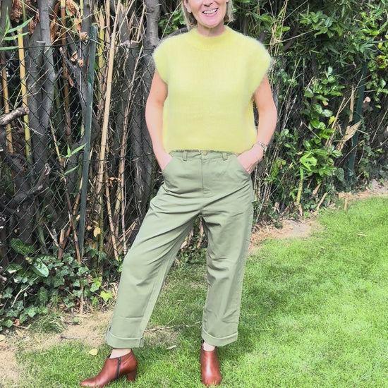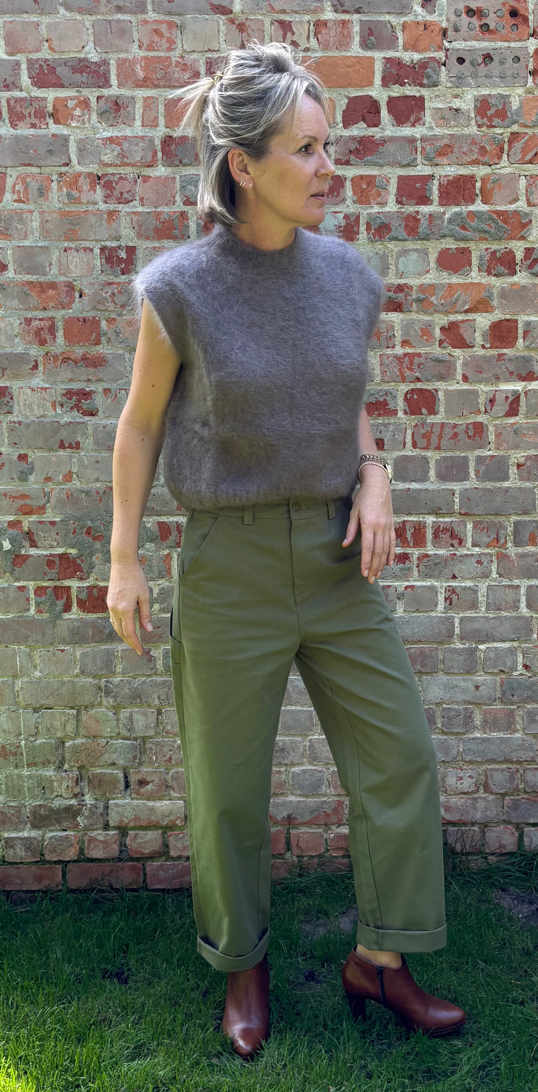Kleur kaki / mid waist / aangename degelijke stof / Sidepocket als subtiel detail / Kan zowel met sneaker als hak / heerlijk om te dragen / Premium merk.