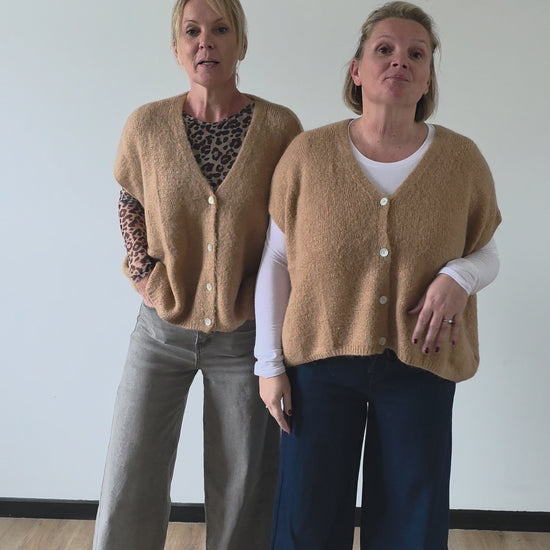 Deze trendy Mohair cardigan is een echte eyecatcher. Zeer mooi op een baggy pants of jeans. Kan gedragen worden met een t-shirt of blouse. Lekker warm en zacht! Taille unique en oversized dus deze past iedereen. Mooie warme camel kleur die heel makkelijk te combineren is met andere herfst- en winterkleuren.